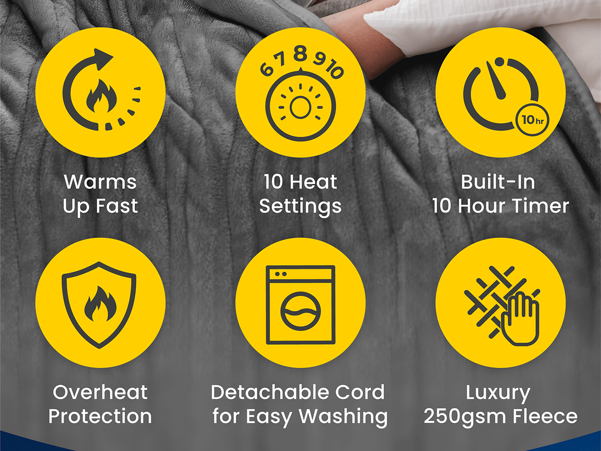 Fancy being snuggly and warm in the comfort of your home without having to turn the central heating on or find multiple blankets to wrap yourself in? Our Fleece Electric Heated Throw will keep you toasty warm on chilly evenings. The throw features 10 fully adjustable temperature settings giving you complete heating flexibility. All settings are controlled by the simple and easy-to-use remote control that allows you to achieve and maintain your ideal level of warmth. A built-in 9-hour timer, auto and overheat function make it perfect for use on the sofa or when falling asleep.